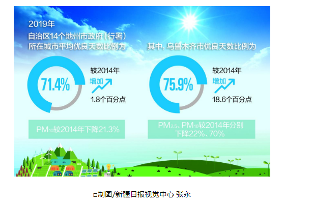 數(shù)據(jù)顯示,2019年,自治區(qū)14個(gè)地州市政府(行署)所在城市平均優(yōu)良天數(shù)比例為71.4%,較2014年增加1.8個(gè)百分點(diǎn),PM10較2014年下降21.3%。其中,烏魯木齊市優(yōu)良天數(shù)比例為75.9%,較2014年的57.3%增加18.6個(gè)百分點(diǎn),重污染天數(shù)比例為6.3%,較2014年減少0.5個(gè)百分點(diǎn),PM2.5、PM10較2014年分別下降22%、70%。