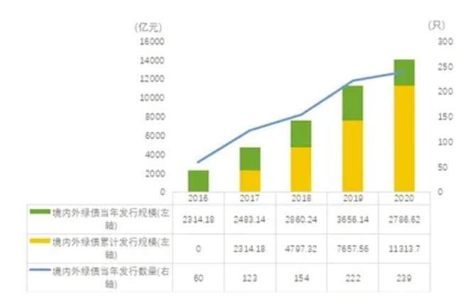 圖為 2016-2020年中國境內(nèi)外綠色債券發(fā)行數(shù)量及規(guī)模 摘自《簡報》