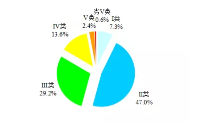 1940個國家地表水考核斷面中,水質(zhì)優(yōu)良(Ⅰ~Ⅲ類)斷面比例為83.4%,同比上升8.5個百分點;劣Ⅴ類為0.6%,同比下降2.8個百分點。主要污染指標(biāo)為化學(xué)需氧量、總磷和高錳酸鹽指數(shù)。