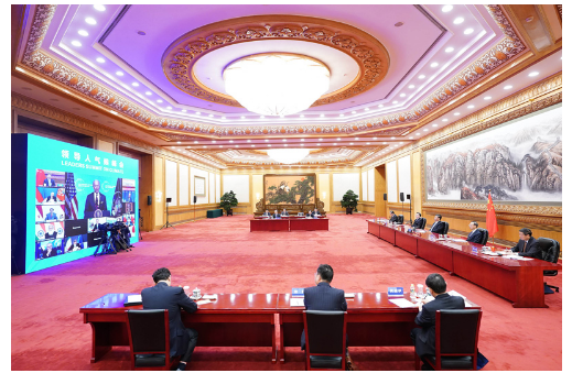 4月22日晚,應(yīng)美國總統(tǒng)拜登邀請,國家主席習(xí)近平在北京以視頻方式出席領(lǐng)導(dǎo)人氣候峰會,并發(fā)表題為《共同構(gòu)建人與自然生命共同體》的重要講話。新華社記者 李響 攝