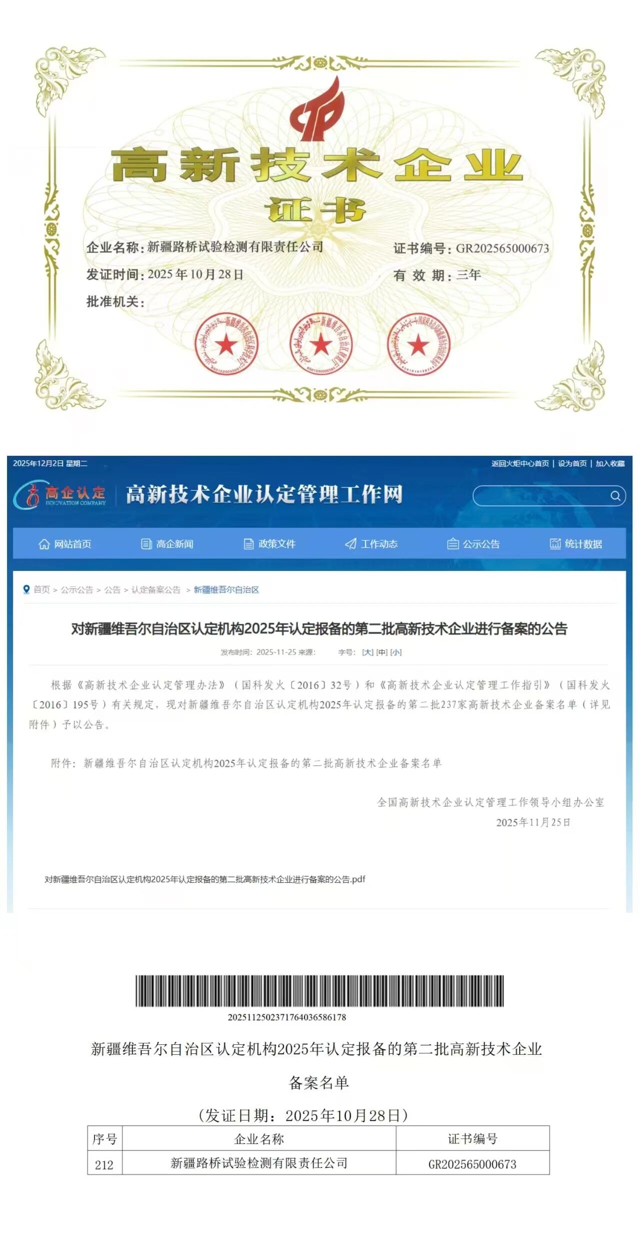 喜報(bào)!新疆路橋試驗(yàn)檢測(cè)公司獲評(píng)國家高新技術(shù)企業(yè)
