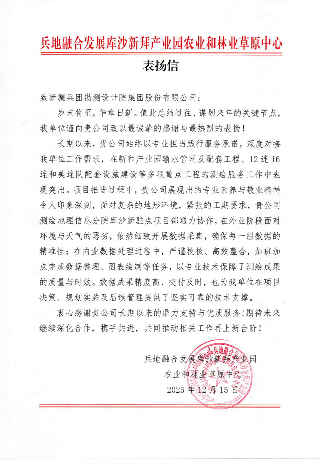 12月15日,測繪地理信息分院收到來自兵地融合發(fā)展庫沙新拜產(chǎn)業(yè)園農(nóng)業(yè)和林業(yè)草原中心的感謝信,對我院在新和產(chǎn)業(yè)園輸水管網(wǎng)及配套工程、和美連隊(duì)配套設(shè)施建設(shè)等重點(diǎn)項(xiàng)目中提供的測繪服務(wù)給予高度評價(jià)與誠摯感謝。