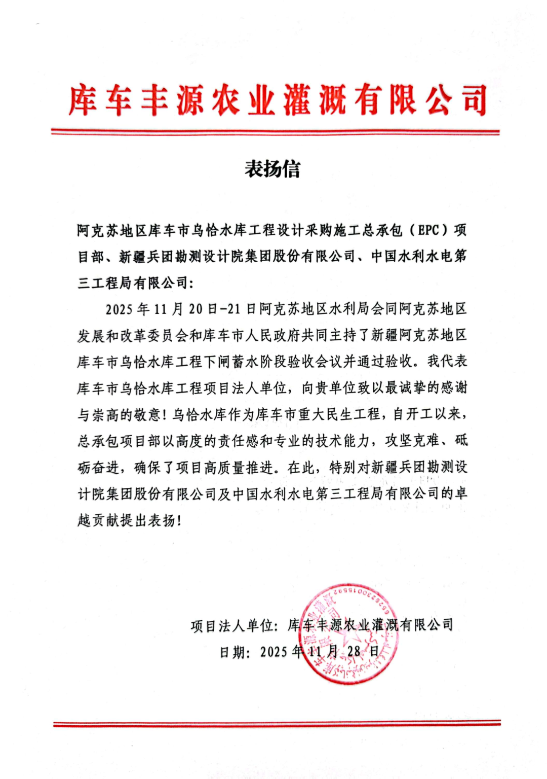 近日,二分院牽頭承擔(dān)的阿克蘇地區(qū)庫車市烏恰水庫工程設(shè)計(jì)采購施工總承包(EPC)項(xiàng)目,收到了來自庫車豐源農(nóng)業(yè)灌溉有限公司的表揚(yáng)信。